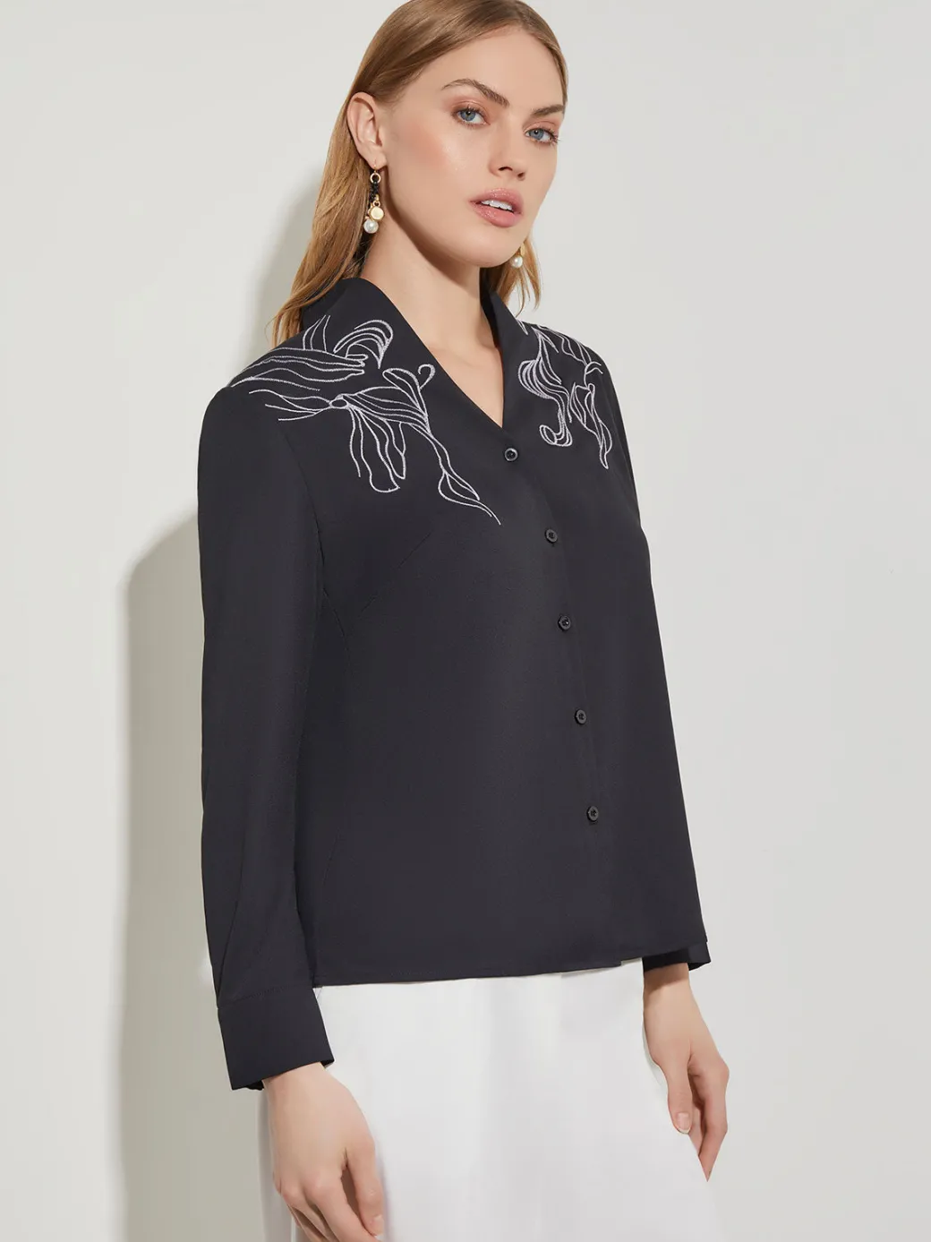 Abstract Stitch Embroidered Button-Front Crepe Blouse|Misook New
