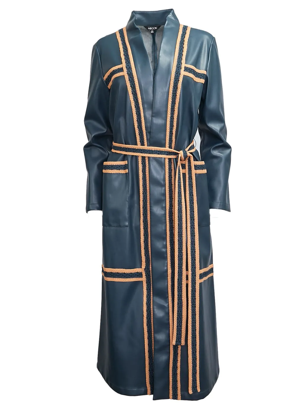 An absolute statement of outstanding craftsmanship, our Belted Long Vegan Leather Jacket is a gallery-worthy staple designed with the smooth finish of sustainable vegan leather. The rich Marine Teal color is artfully contrasted with Black and Goldenwood trim. With a sleek open front, this heritage-fit jacket is accented with a removable tie belt that cinches to create a feminine form. Layer it for a show-stopping ensemble as the weather cools.