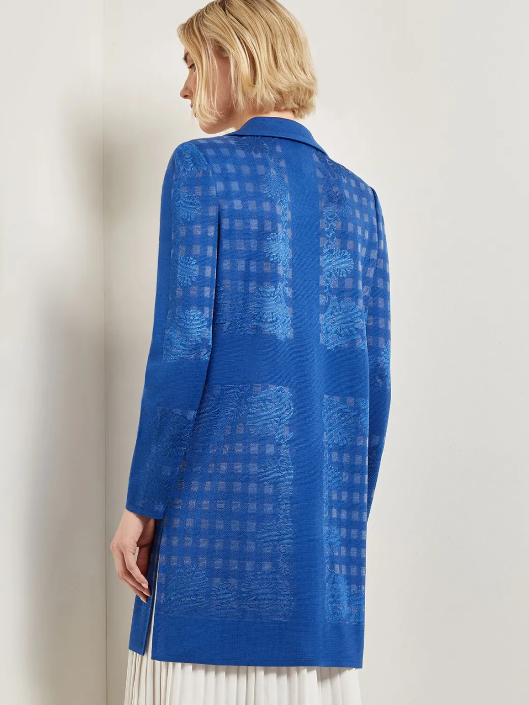 Our relaxed-fit Burnout Floral Pattern Knit Jacket is proof that textural interest elevates any closet staple. This stunning jacket features a beautiful floral and geometric pattern with sheer lacy windows. A classic lapel collar adds to its sophistication, while a long length offers fresh styling possibilities.