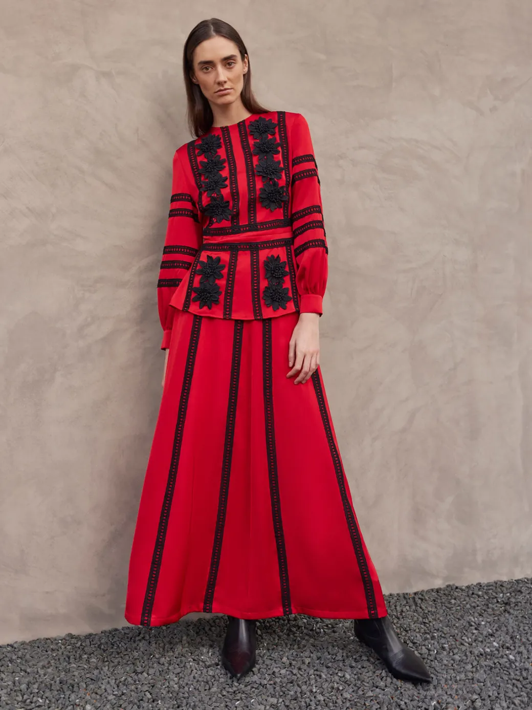 Our Floral Lace Peplum Blouse features a hand-sewn lace applique throughout the garment. The cuffed long sleeves and peplum feature give this blouse subtle volume. Pair this blouse with our matching skirt to pull the whole look together.