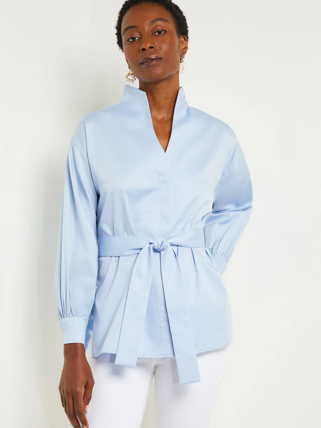 Funnel Neck Belted Cotton Blouse|Misook Online