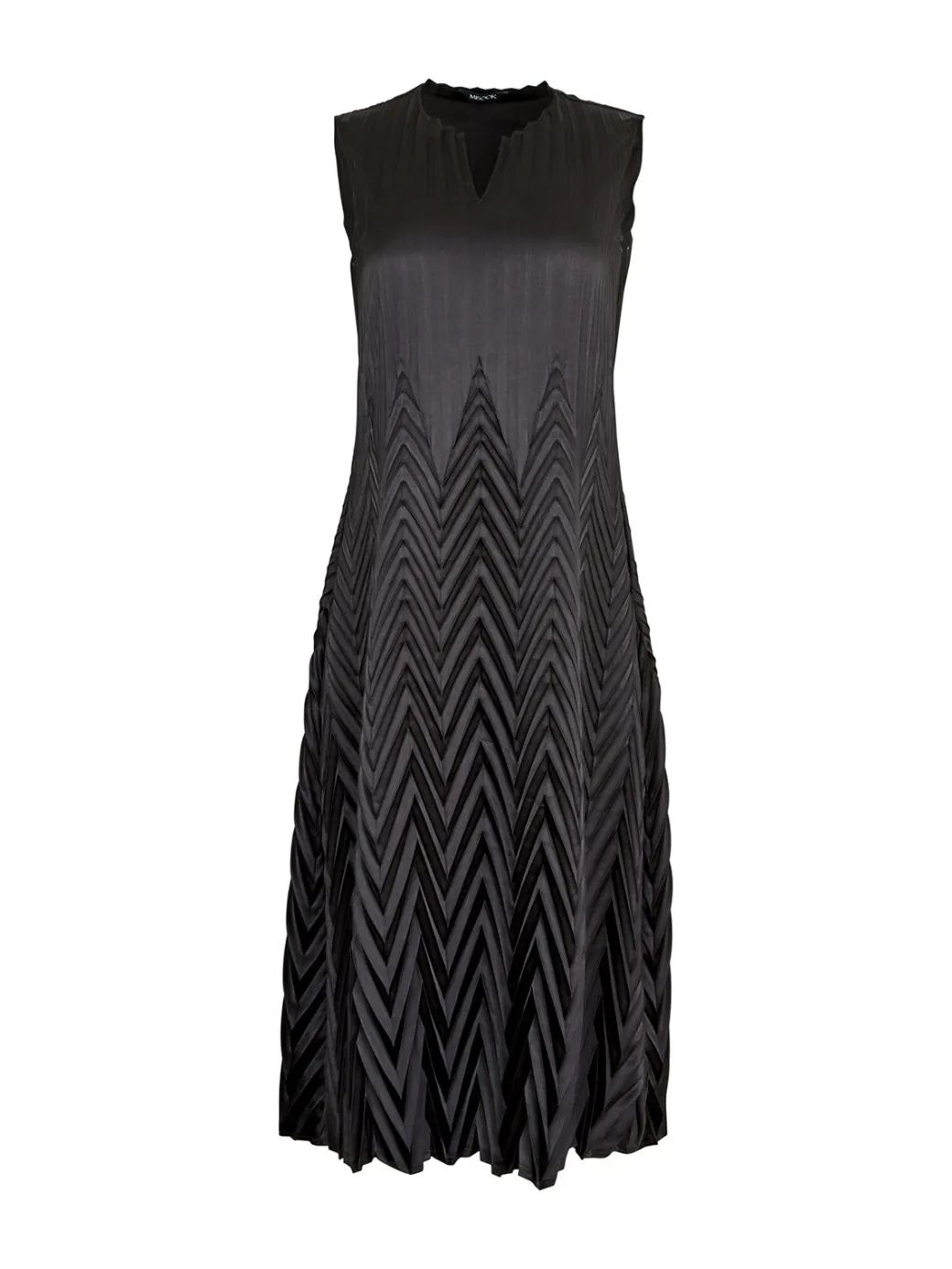 Indulge in the epitome of elegance with our Midi Sheath Dress in luxurious Chevron Textured Crepe De Chine. The sleeveless design and pullover style ensure ease of wear, while the split V-neck adds a touch of allure. Elevate your silhouette with the flattering chevron detailing at the waist, contrasting with the vertical pleats that cover the chest.