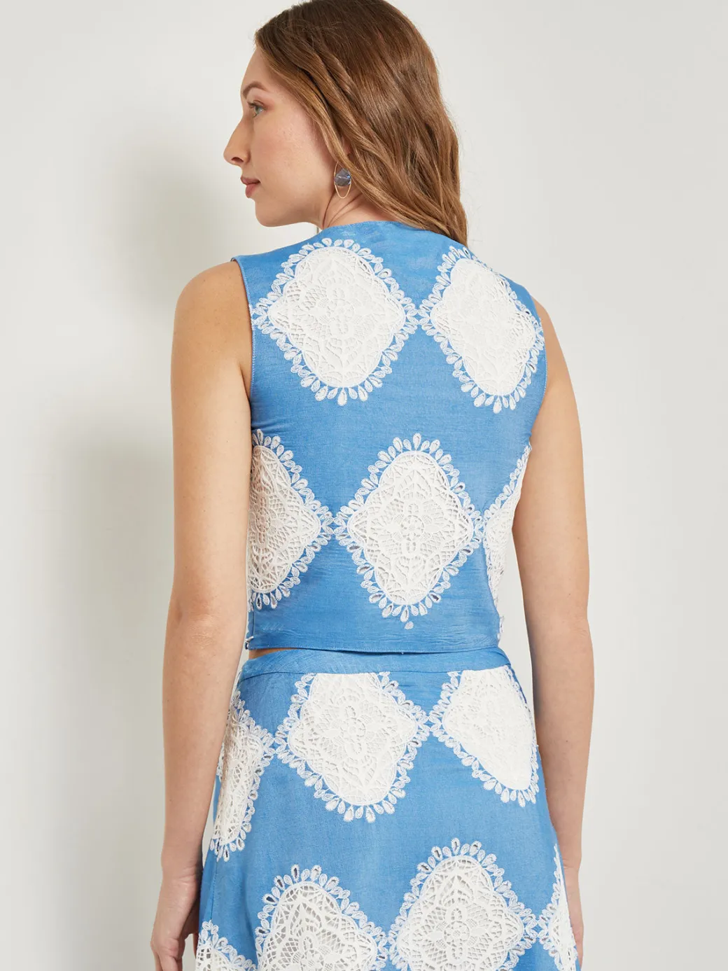 Embrace the allure of sleeveless sophistication with our Woven Cropped Tank, secured by a side zipper. An intricate lace inset is meticulously hand-placed and stitched, surrounded by matching applique to enhance the look. Pair this with the matching skirt and jacket for a complete look.