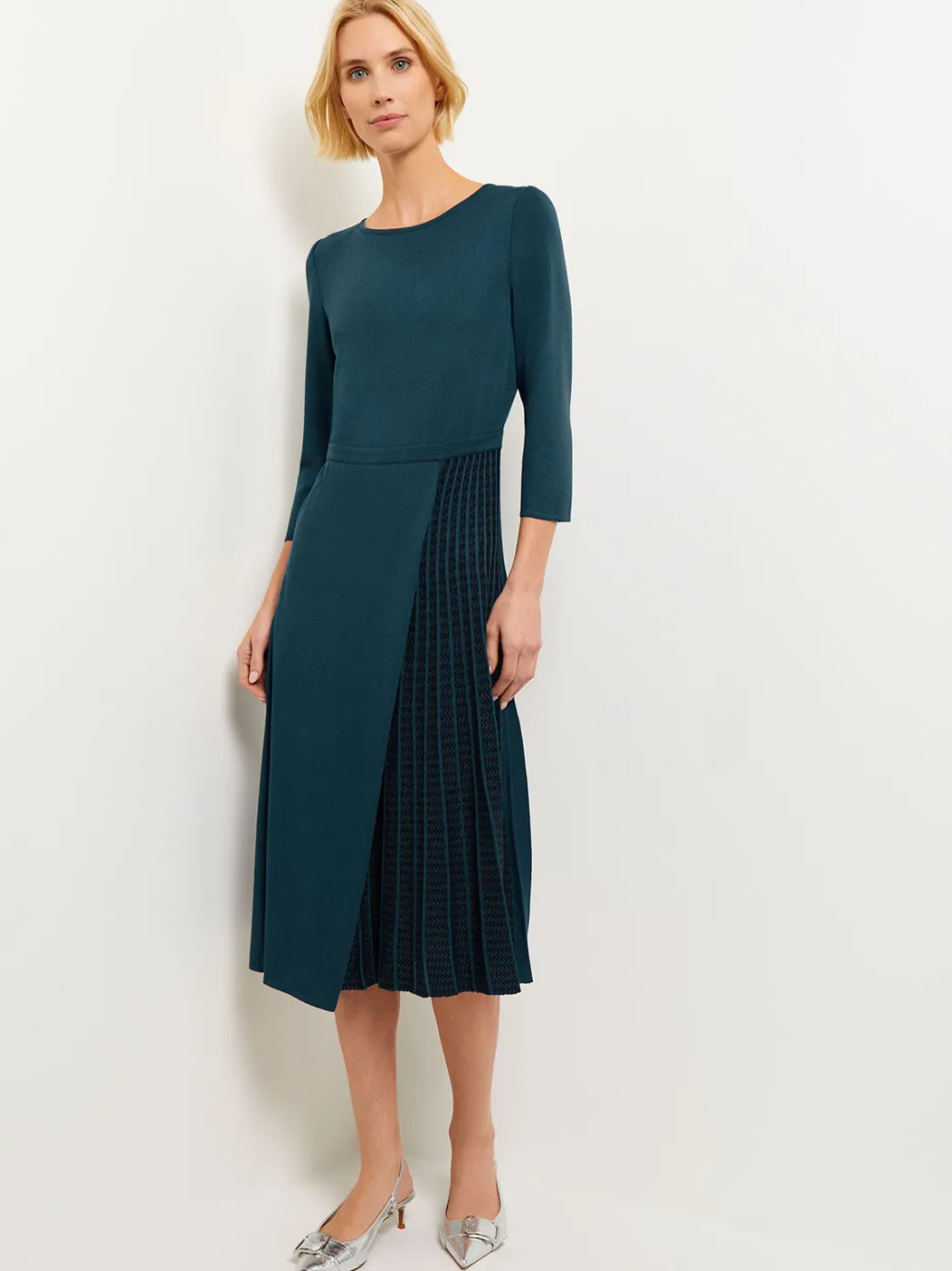 Pleated Contrast Panel Soft Knit Dress|Misook Outlet