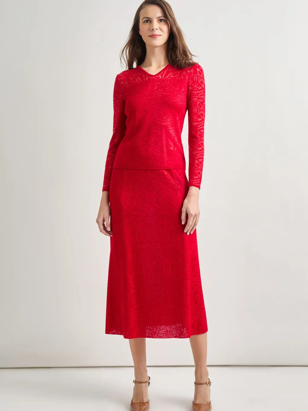 This Tonal Patterned V-Neck Knit Top features a pullover design and long sleeves. The long sleeves are crafted from a delicate burnout knit, making this piece a great transition garment for the fall days. Pair with the matching skirt for a complete tonal look.