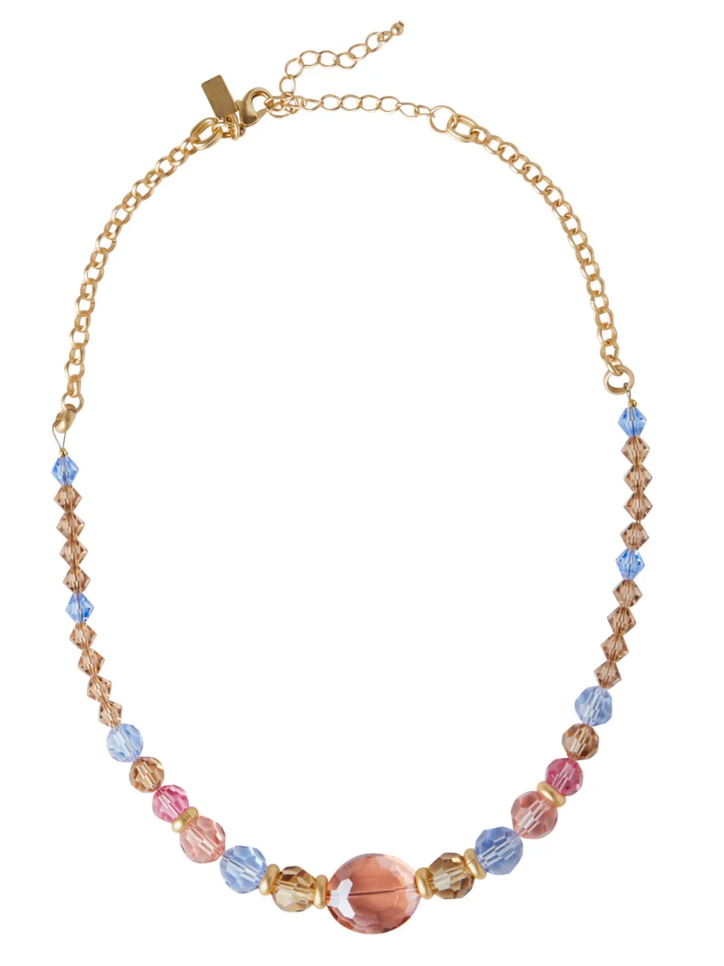 Our 18K Matte Gold Plated Crystal Necklace stars variations of Blue, Peach, and Champagne crystals with Matte gold spacers. A perfect neutral addition to your accessory collection, this necklace can pair with a wide variety of outfits.