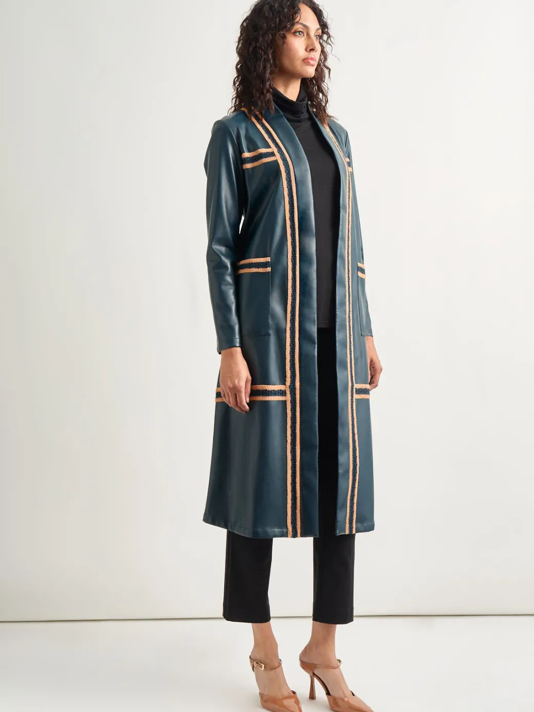 An absolute statement of outstanding craftsmanship, our Belted Long Vegan Leather Jacket is a gallery-worthy staple designed with the smooth finish of sustainable vegan leather. The rich Marine Teal color is artfully contrasted with Black and Goldenwood trim. With a sleek open front, this heritage-fit jacket is accented with a removable tie belt that cinches to create a feminine form. Layer it for a show-stopping ensemble as the weather cools.