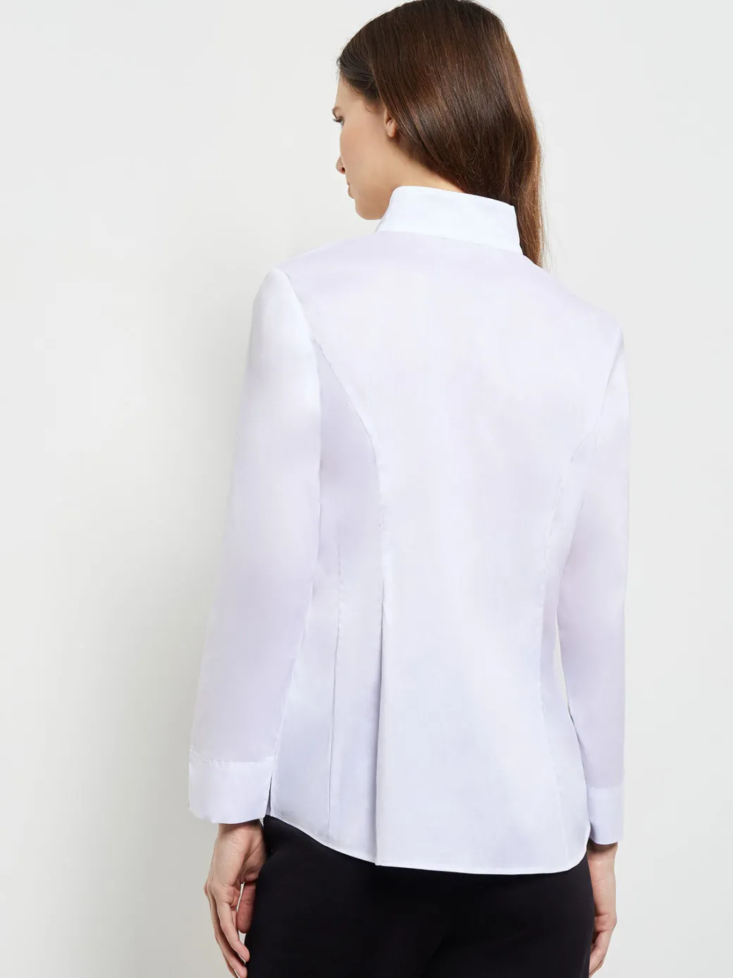 The classic white blouse gets a modern update with an elegant high neckline and a perfectly tailored silhouette. Crafted in our breathable stretch cotton material with a modern stand collar and elegant seaming, this comfortable and flattering blouse is the perfect layering piece for any occasion. Worn on its own or under your favorite Misook jacket, this blouse will become your new favorite basic for year-round wear.
