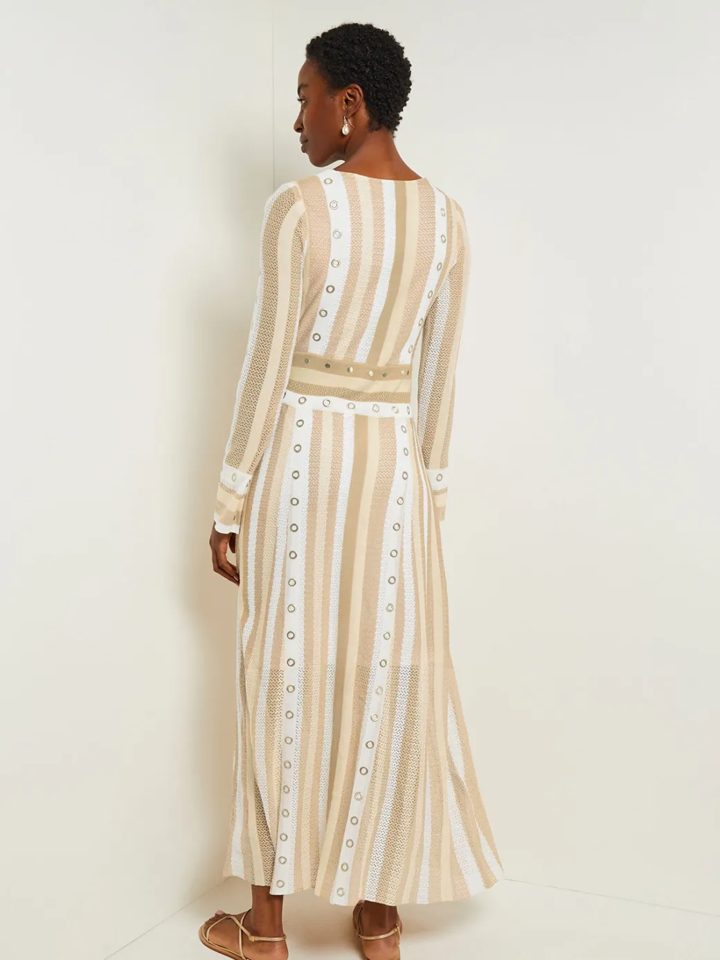 Make a subtle yet powerful statement in our brilliant Maxi A-Line Dress, masterfully knit utilizing the full fashion method to blend together three different stitching techniques. Neutral stripes in solid and pointelle panels line the body, while sheer stripes are added into the mix on the sleeves for enhanced breathability. Hand-applied grommet details add visual impact, enhanced by the sharpness of the square neckline.