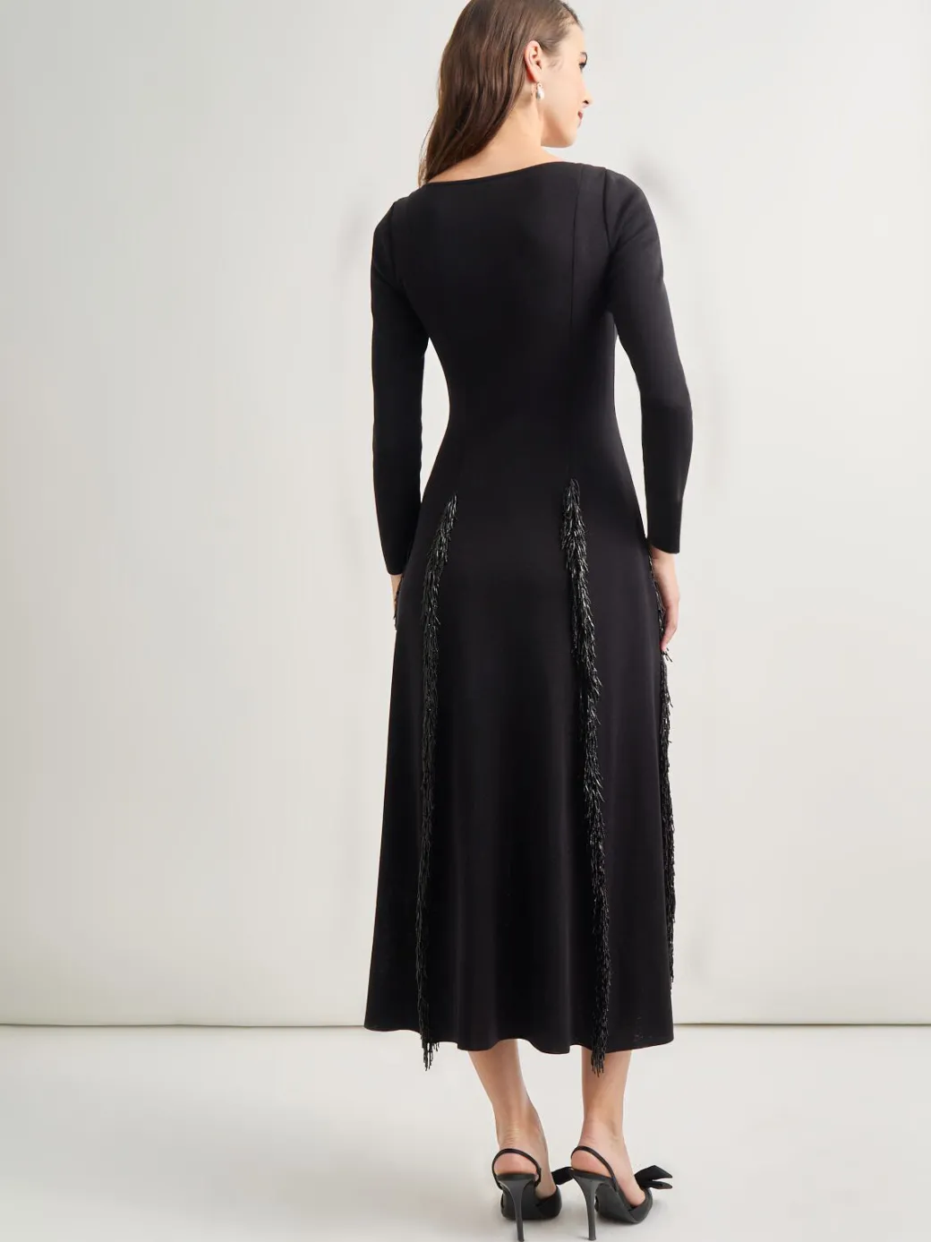 Our Fit-and-Flare Sequin Maxi Dress is a gorgeous addition to your wardrobe. This dress has a modest neckline, full length sleeves and sequined princess seams for a touch of elegance. Whether you’re dazzling your company at the end of year party or you just want to shine for yourself, this dress is perfect.