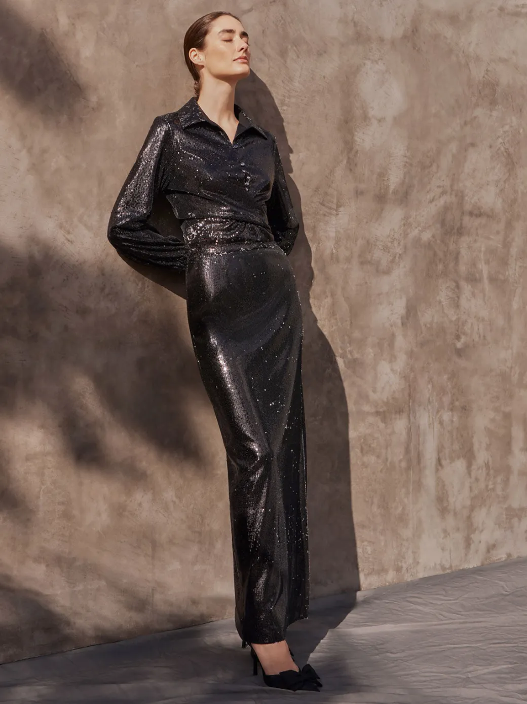 Our Sequin Novelty Woven Blouse is a dazzling piece that is perfect for the office holiday event. Featuring a shirt-collar neckline, this blouse is both sophisticated and fun. The removable belt gives you the ability to choose your desired silhouette. The long sleeves are adorned with elastic cuffs to ensure comfort throughout the day.