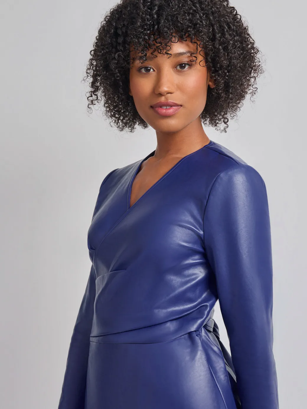 Our Tailored Fit Vegan Leather Tie Jacket is the missing piece from your wardrobe. The tie back feature creates an hourglass shape while the surplice neckline draws the eye down, elongating your silhouette. Pair this unique piece back to the vegan leather skirt for a complete tonal outfit.